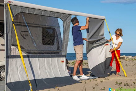 Fiamma Blocker Pro je praktické riešenie pre karavanistov, ktorí chcú zvýšiť komfort pri pobyte vonku. Predná stena sa jednoducho zasúva do kédrovej lišty markízy a upevňuje sa pomocou kolíkov. Priehľadné okno z materiálu Crystal prepúšťa svetlo, zatiaľ čo spodná vinylová časť chráni pred vetrom.