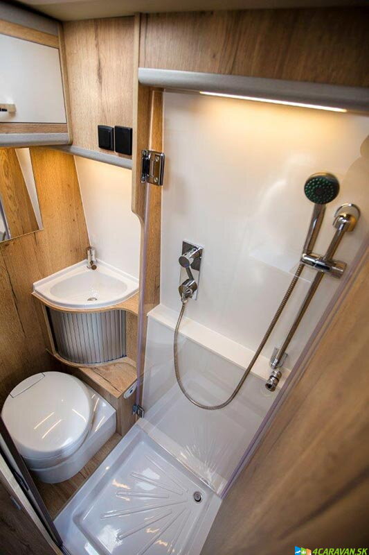 Ešte viac miesta v prémiovej kúpeľni Megamobil! Každý člen rodiny tu má dostatok miesta. Priestranná horná skrinka a skvelá spodná skrinka umývadla ponúkajú veľa úložného priestoru. S otočnými dverami z prémiového akrylového číreho skla môžete tiež premeniť kúpeľňu v Mega Revolution na pohodlný sprchový kút! Funkcia otáčania chráni kazetové WC, umývadlo a skrinky pred vlhkosťou pri sprchovaní. Skvelé strešné okno Heki poskytuje denné svetlo a dostatočné vetranie. Rozsiahle LED osvetlenie zaručuje dobré svetlo v kúpeľni. Samozrejmosťou je aj štandardná zásuvka na 230 V.