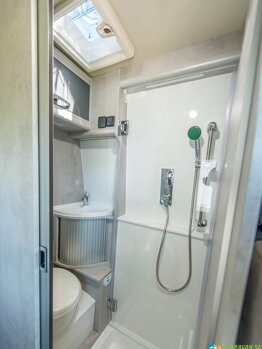 V Mega Vario Aktiv 680 na vás čaká špičková kúpeľňa! Rohové umývadlo a kazetové WC sú pri sprchovaní chránené pred vlhkosťou otočnými dvierkami z akrylátového číreho skla. Štandardné strešné okno Heki zabezpečuje dostatočné vetranie. V nástennej skrinke sú uložené vaše osobné hygienické potreby a LED osvetlenie vytvára príjemnú atmosféru v kúpeľni. Samozrejmosťou je inštalovaná aj 230V zásuvka na elektrickú zubnú kefku, holiaci strojček alebo fén.