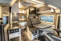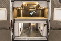 Maximálny oddych v zadnej časti vďaka priestrannému priečnemu lôžku s rozmermi 192 x 140 cm, ktorého lamelový rošt je možné zložiť a rozšíriť tak úložný priestor. Bočné steny zadnej časti majú kvalitné polstrovanie. V celom interiéri nájdete rôzne zásuvky 230V/12V, ako aj energeticky úsporné LED osvetlenie.