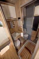 V Mega Classic 600 na vás čaká špičková kúpeľňa! Rohové umývadlo a kazetové WC sú pri sprchovaní chránené pred striekajúcou vodou otočnými dverami z akrylátového číreho skla. Štandardné strešné okno Heki zabezpečuje dostatočné vetranie. V nástennej skrinke sú uložené vaše osobné hygienické potreby a LED osvetlenie vytvára príjemnú atmosféru v kúpeľni. Samozrejmosťou je inštalovaná aj 230V zásuvka na elektrickú zubnú kefku alebo fén.