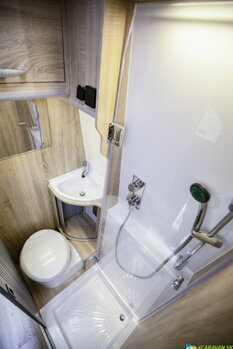 Ešte viac miesta v prémiovej kúpeľni Megamobil s Mega Revolution! Každý člen rodiny tu má dostatok miesta. Priestranná horná skrinka a skvelá spodná skrinka pod umývadlom ponúkajú veľa úložného priestoru. S otočnými dverami z prémiového akrylového číreho skla môžete tiež premeniť kúpeľňu v Mega Revolution na kompaktnýsprchový kút bez nutnosti baliť sa do závesu! Funkcia otáčania chráni kazetové WC, umývadlo a skrinky pred vodou pri sprchovaní. Skvelé strešné okno Heki poskytuje denné svetlo a dostatočné vetranie. Rozsiahle LED osvetlenie zaručuje dobré svetlo v kúpeľni. Samozrejmosťou je aj štandardná zásuvka na 230 V.